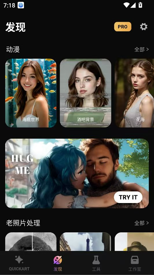 【应用简介】Quick Art是一款最近抖音上超火爆的手机p图软件,此软件拥有着网上流行的古风视频换脸换装特效,还有各种精美的贴纸,各种高质感的滤镜。此外,它还能修复你的老照片,让照片里的人物毫无违和感的动起来,让你的视频和图片充满这个艺术气息,希望你们能喜欢。